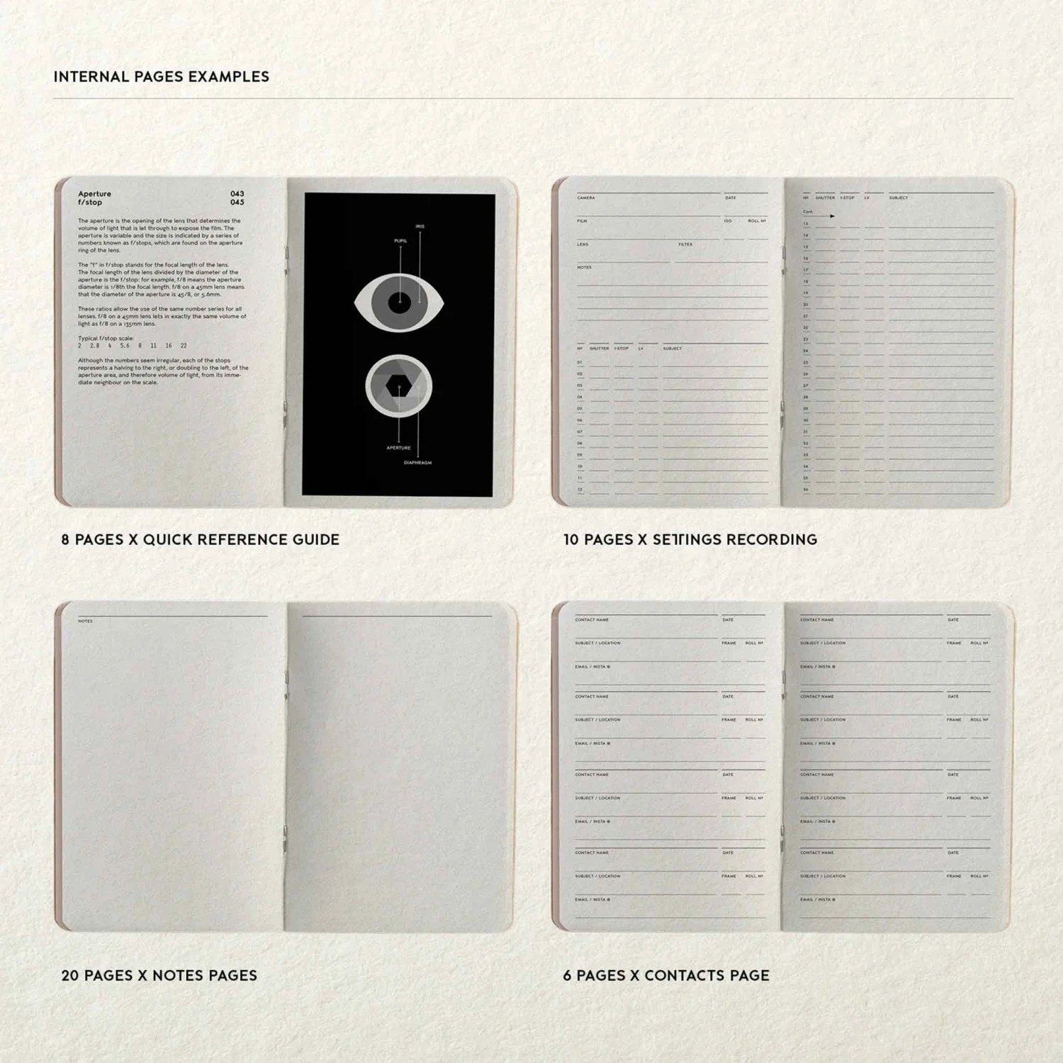 - Comprehensive Recording: Dedicated sections for logging details such as lenses, aperture, shutter speed, and filters for 35mm films.