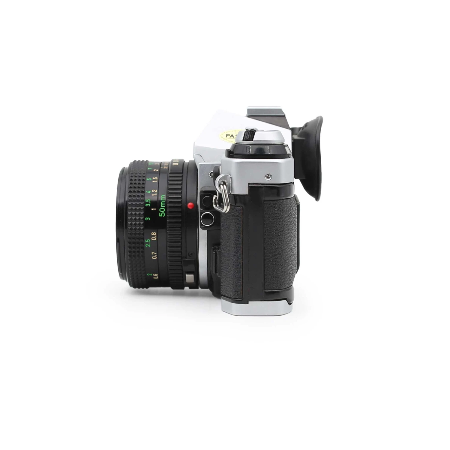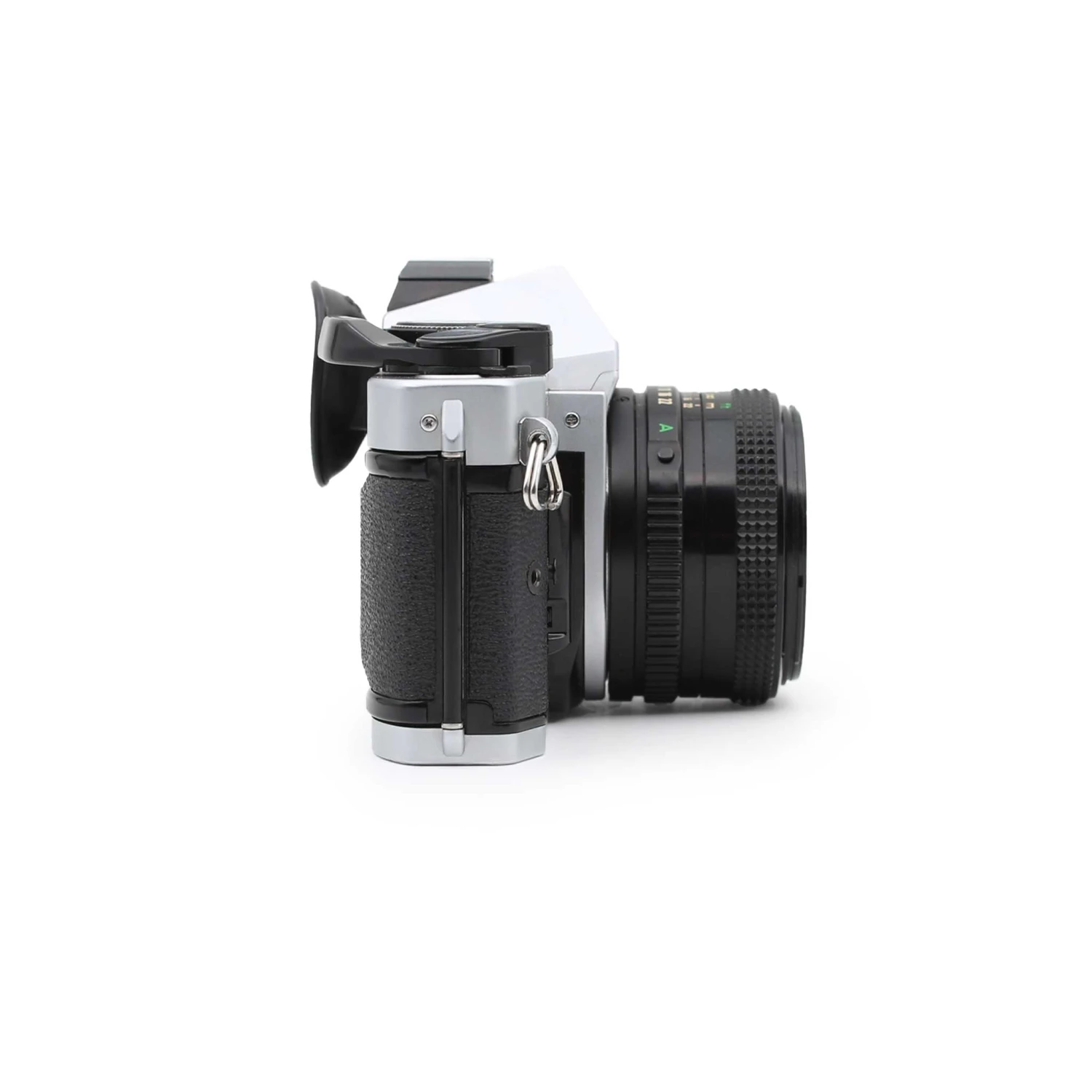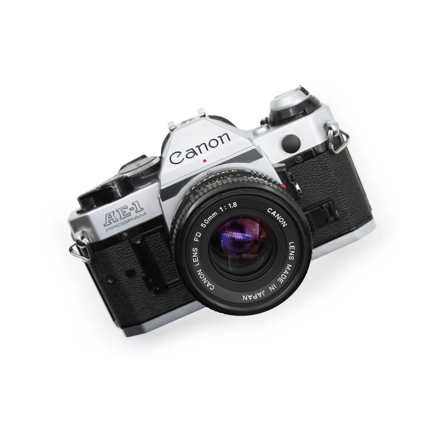 The Canon AE-1 Program is a beginner-friendly, automatic *or* manual 35mm single-lens reflex camera. It features shutter speeds ranging from bulb (indefinite exposure) to 1/1000th of a second, a fast 50mm f/1.8 lens, and a built-in light meter for ease of use. Set the shutter speed dial to “Program” and the camera will select an appropriate shutter speed and aperture automatically – you just need to focus and fire!